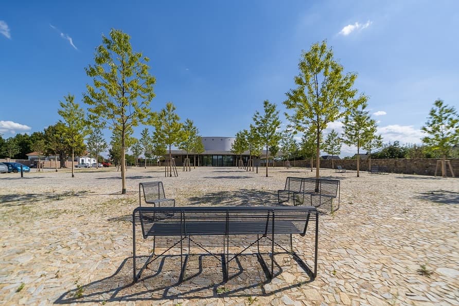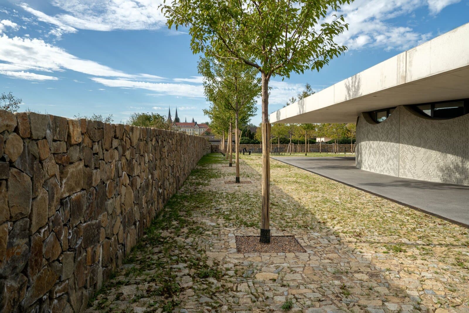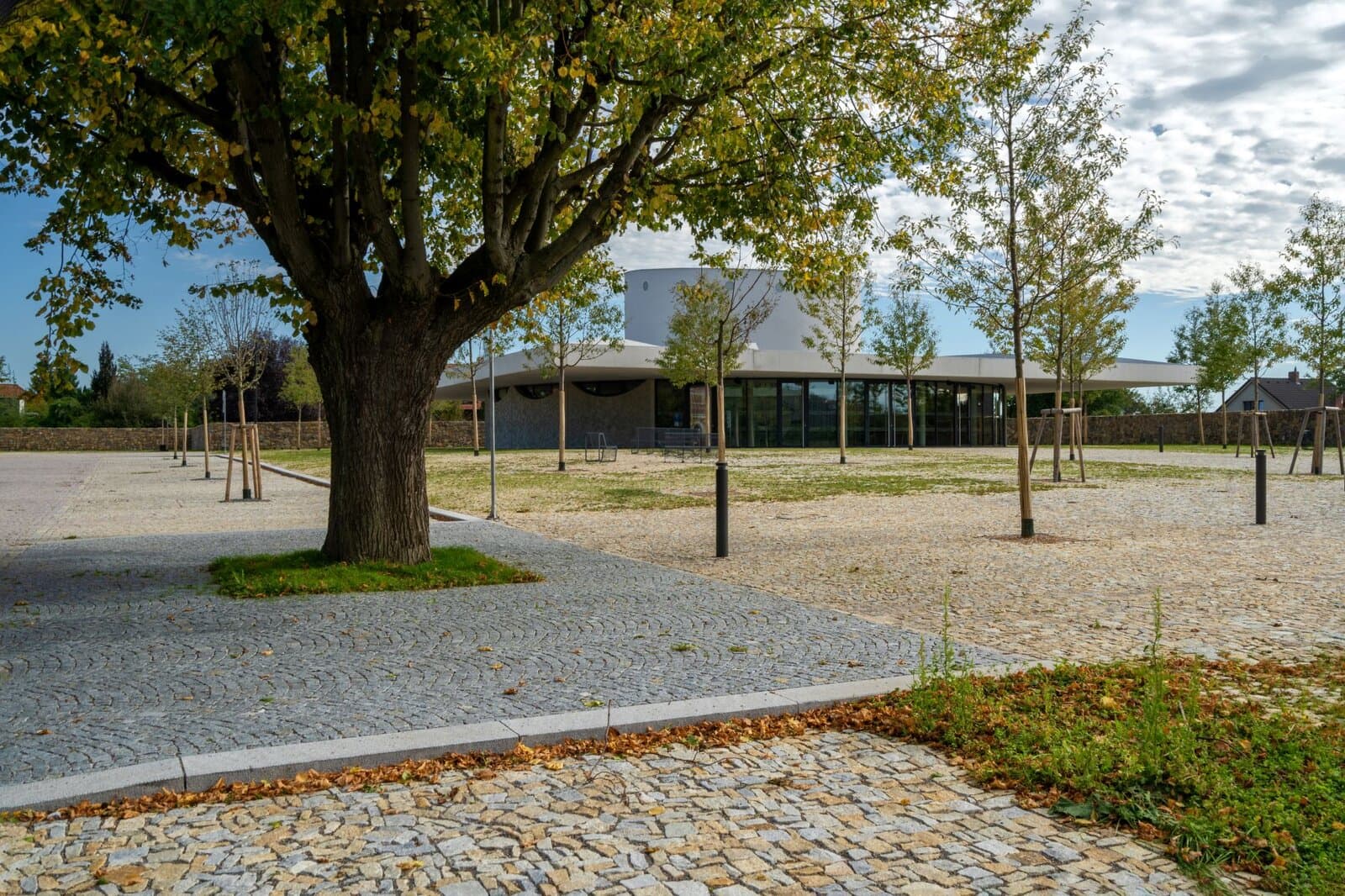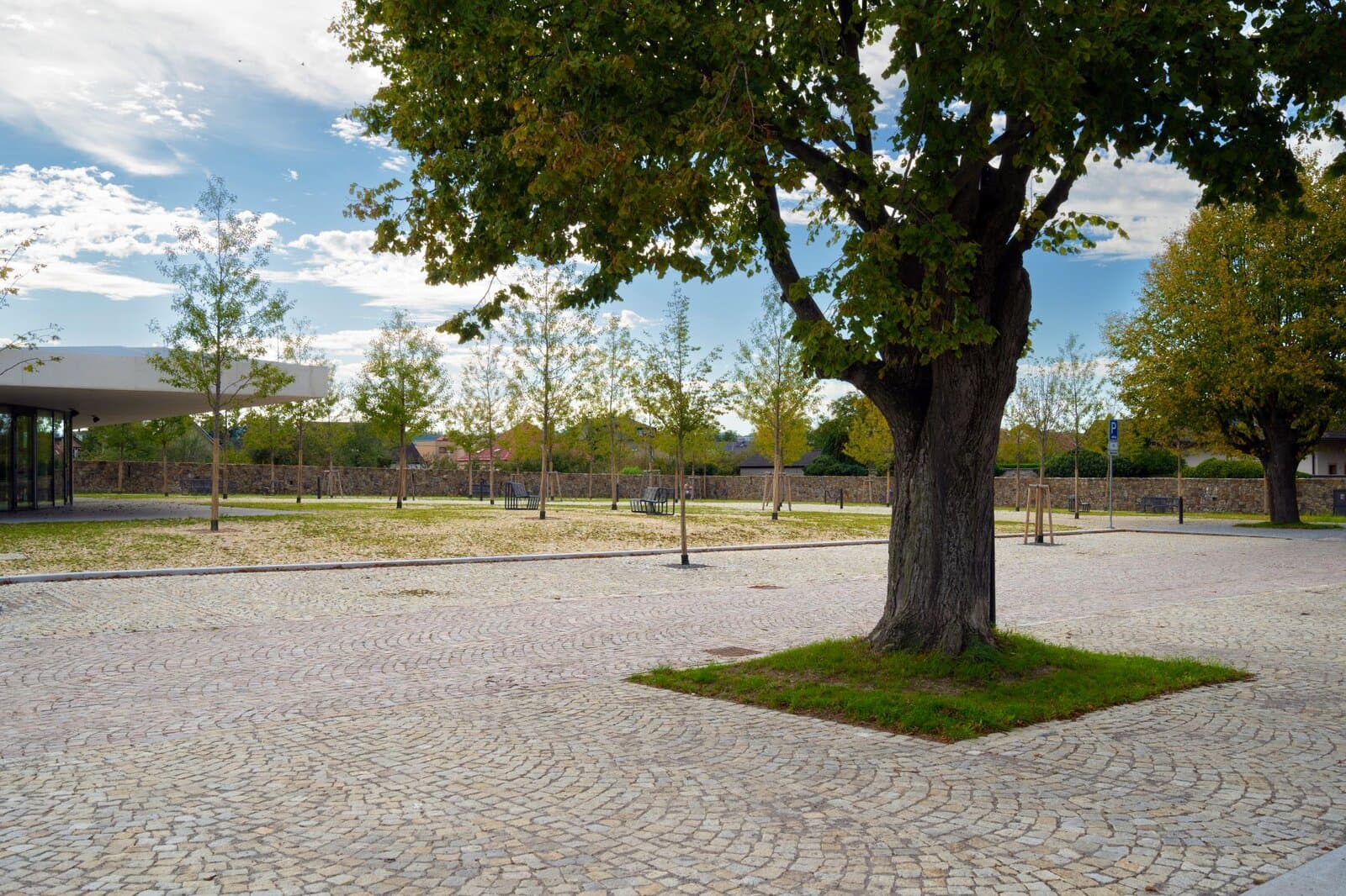 Minimalistická architektura je vyvážena přirozenou texturou štípané žuly. Stromy vyrůstající z kamenné dlažby dávají prostoru lidské měřítko. Kámen zde není pouze podkladovým materiálem – je nositelem identity celého místa.